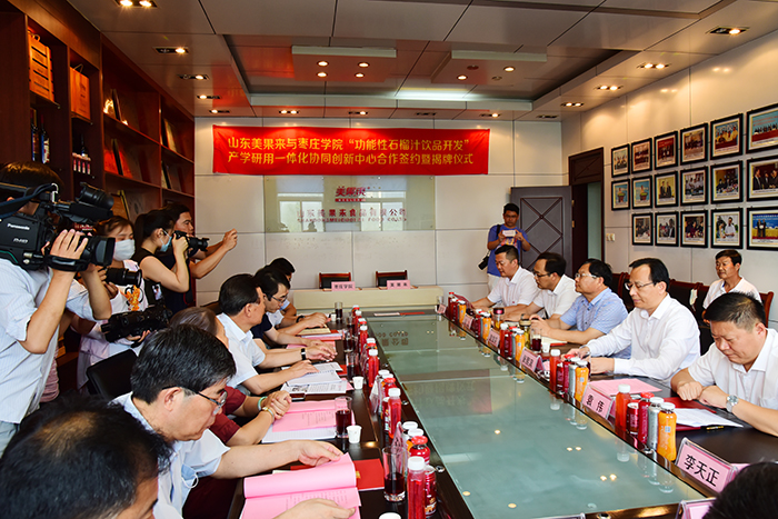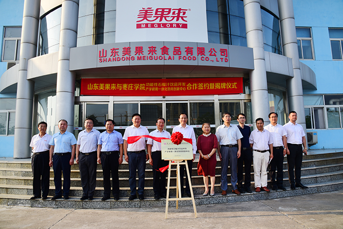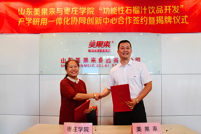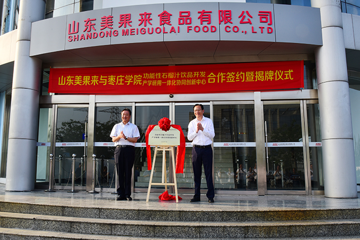 7月7日下午,山东美果来与枣庄学院功能性石榴汁饮品开发产学研用一体化协同创新中心合作签约暨揭牌仪式隆重举行。枣庄学院党委副书记、校长李东,枣庄学院副校长李丽清,枣庄学院科技处处长孙正,枣庄学院食品科学与制药工程学院院长王洪凯,枣庄学院办公室副主任丁聪,枣庄学院食品科学与制药工程学院副院长张立华,枣庄学院食品科学教研室主任孙中贯;区委副书记、区长张熙滨,枣庄(峄城)农业高新技术产业园示范区发展服务中心主任赵俊平,区政府党组成员、办公室主任李天正,榴园镇党委书记冯岩,区科技局局长顿星芳,区招商引资服务中心主任杨硕,山东美果来食品有限公司董事长刘广亮等领导和嘉宾出席签约仪式,活动由区委常委袁伟主持。